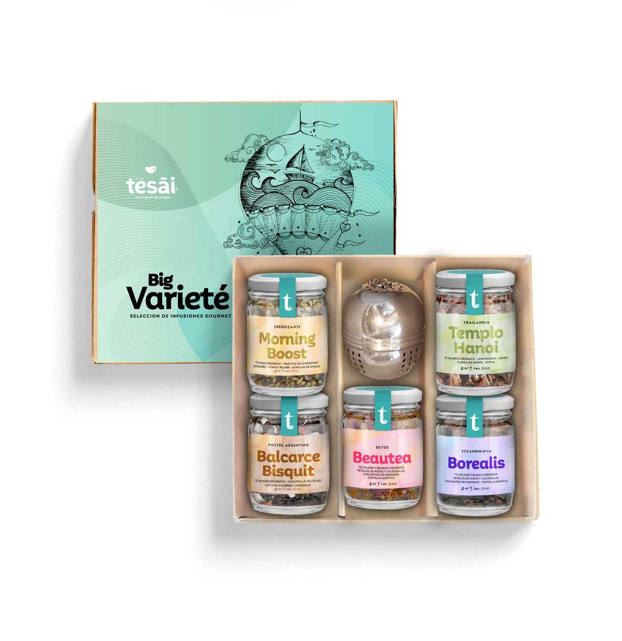 Big Varieté es una propuesta ideal para probar diferentes blends de té. Degustarás 5 blends de té en mini presentación de frasquito de 20 grs. aprox cada uno a tu elección (dependiendo disponibilidad) + infusor de metal. También podes reemplazar el infusor por otro frasquito de té