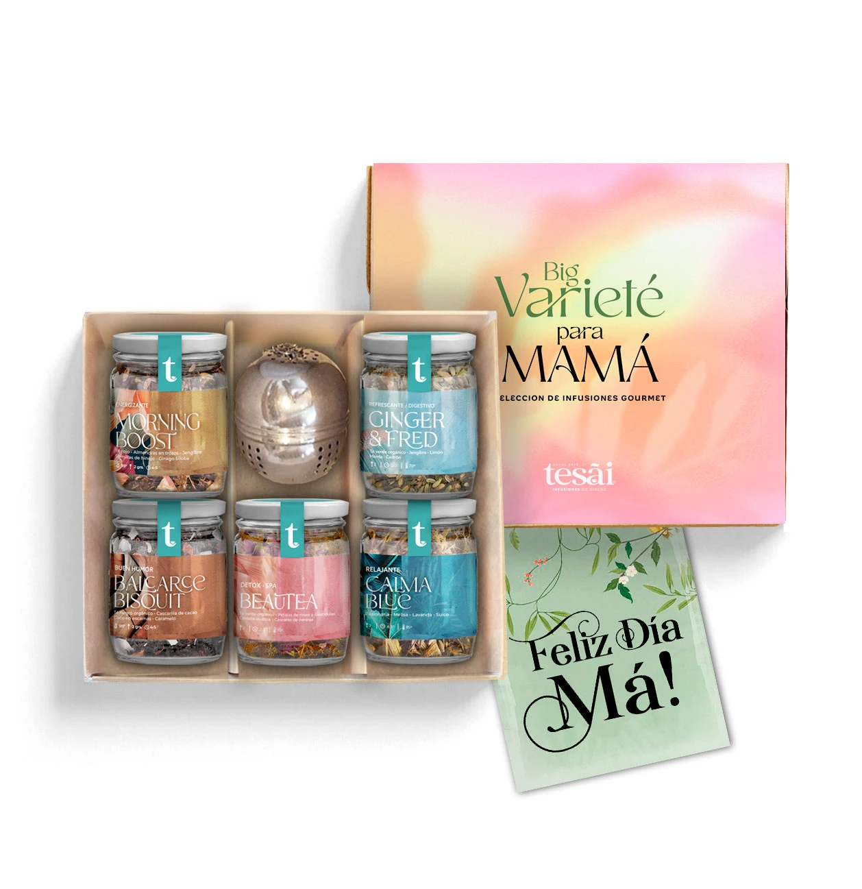 Selección de 5 mini blends de té en hebras, infusor de metal en box de regalo. Incluye tarjetita de saludo.