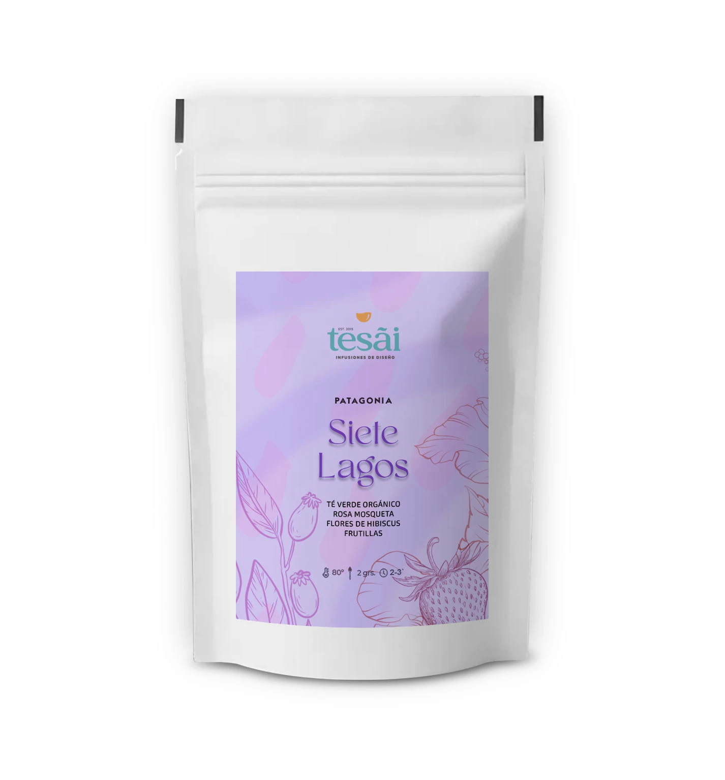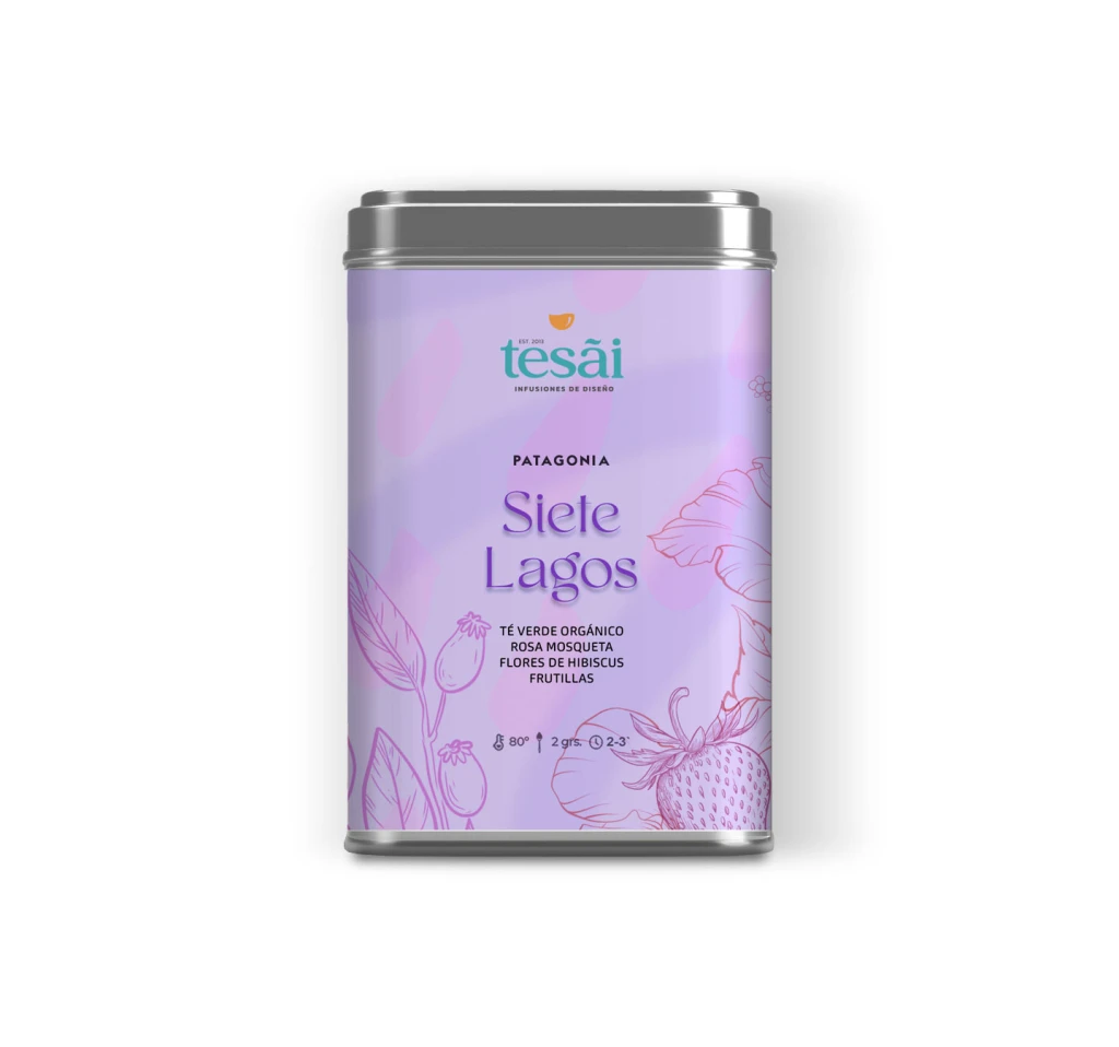 Aromas y sabores de la Patagonia. Té verde orgánico, flores de hibiscus, rosa mosqueta y frutillas en trocitos.